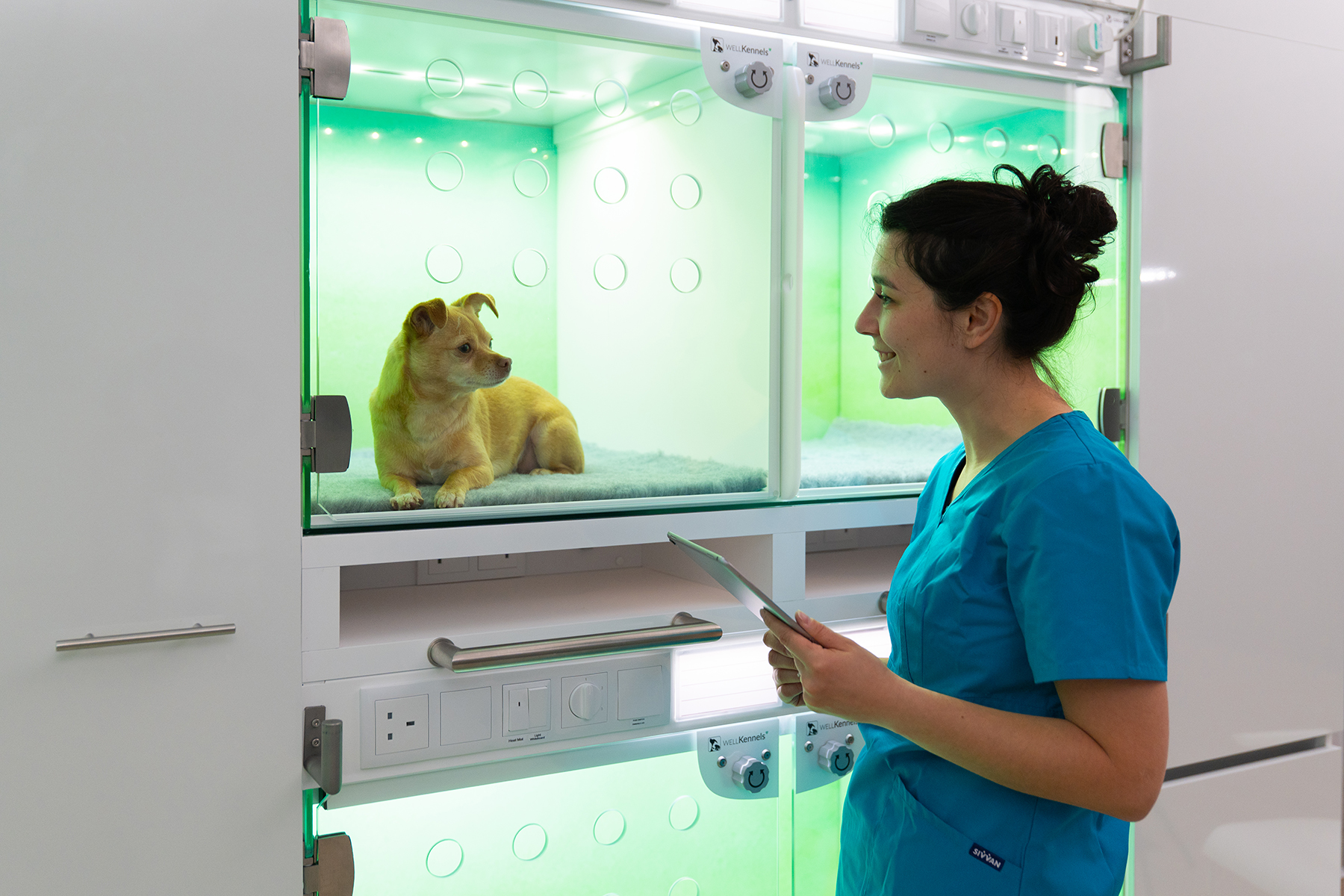 Our dog ward is acoustic insulated and each kennel has individual light and temperature control. We can see into the kennel room without entering and no patient can see another when in their kennel. Separate cat and dog wards and an additional ward for prey species (e.g. rabbits) ensures minimal stress related to smells and sounds.